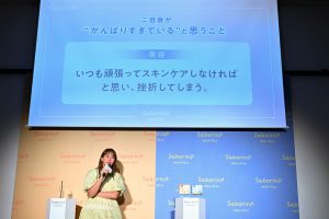 「事前に使ってみましたが、 すごく良かったです!」と早速ご感想を述べ、登壇されました。 続いて、弊社齊藤とのトークセッションや、ブランドメッセージ “がんばらなくても いいジブン” にちなんだトークを披露いただきました。