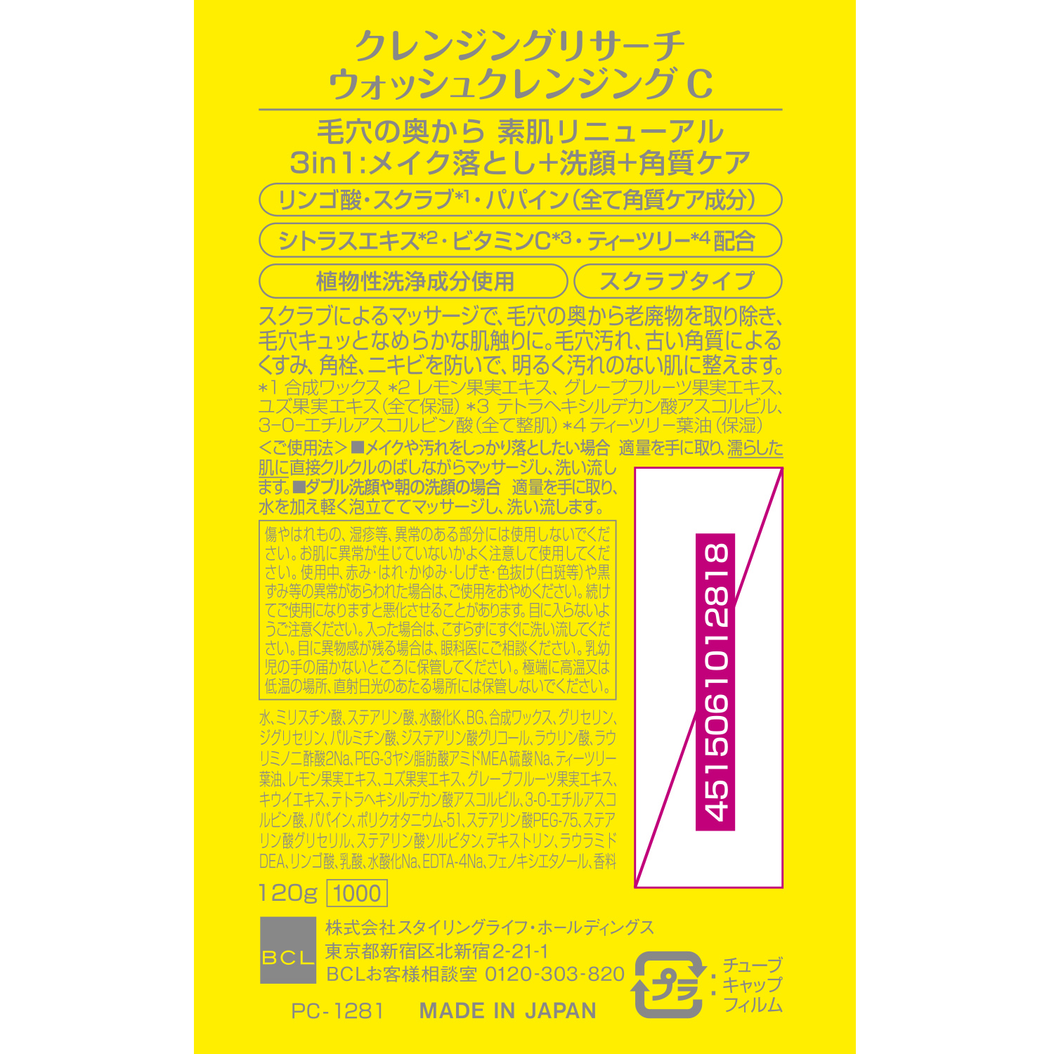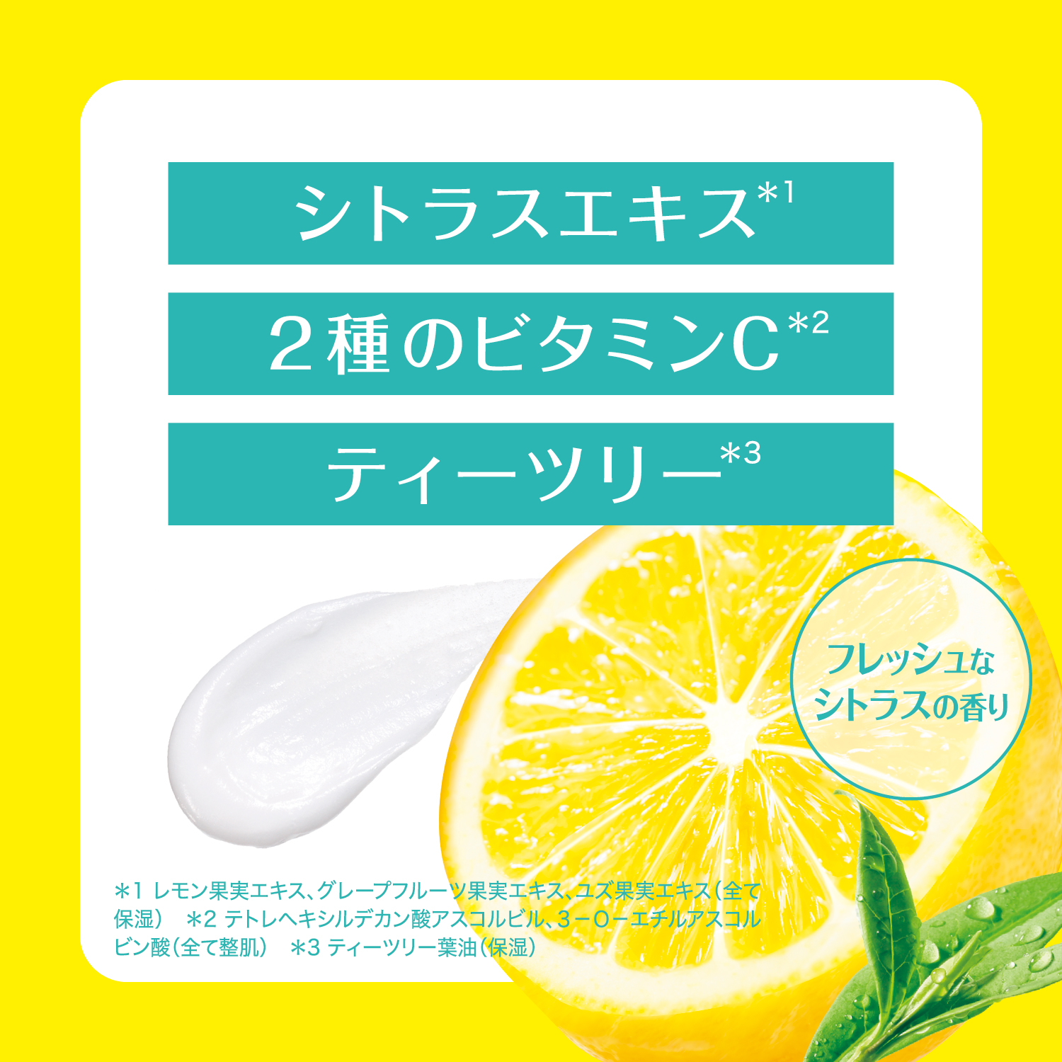 *1 テトラヘキシルデカン酸アスコルビル、3-0-エチルアスコルビン酸 *2 合成ワックス *3 レモン果実エキス、グレープフルーツ果実エキス、ユズ果実エキス *4 ティーツリー葉油