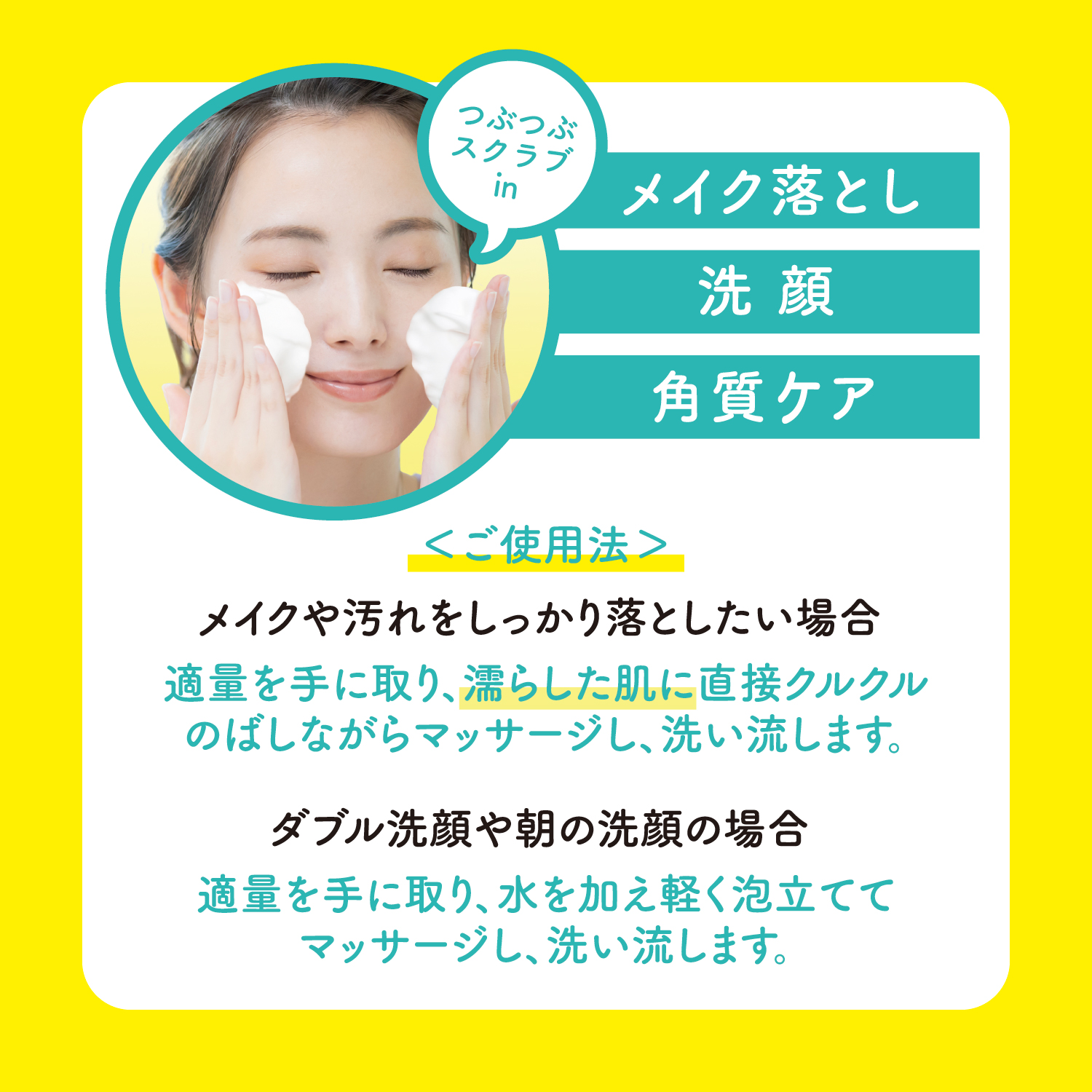 適量を手に取り、泡立てず濡らした肌に直接クルクルのばしながらマッサージし、洗い流します。