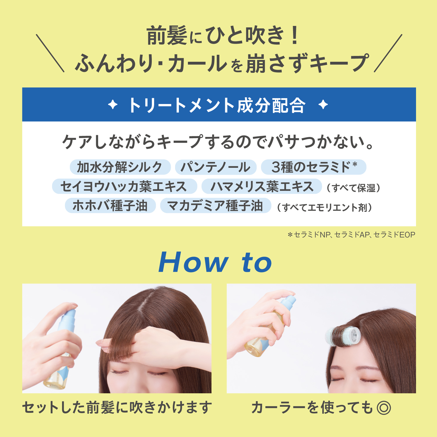 加水分解シルク、パンテノール、3種のセラミド*3、セイヨウハッカ葉エキス、ハマメリス葉エキス