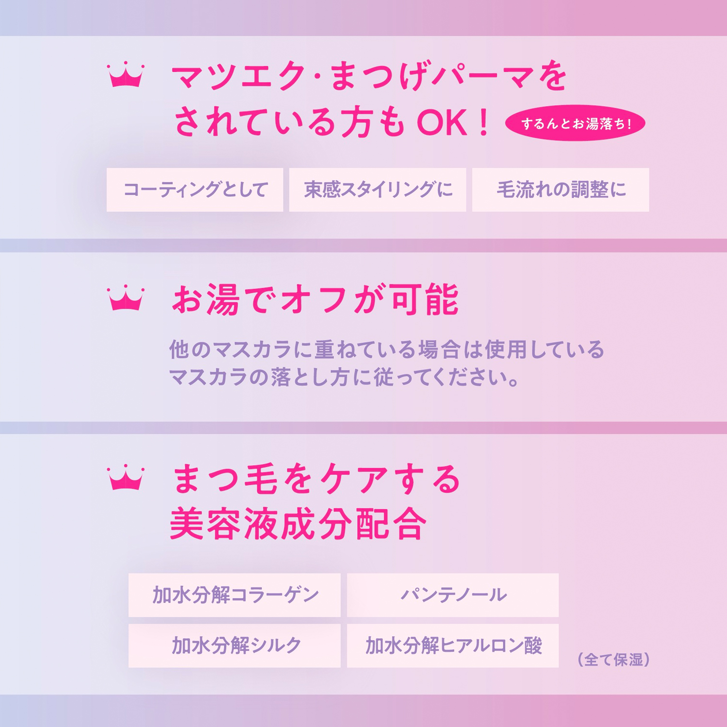 パンテノール、加水分解コラーゲン、加水分解シルク、加水分解ヒアルロン酸