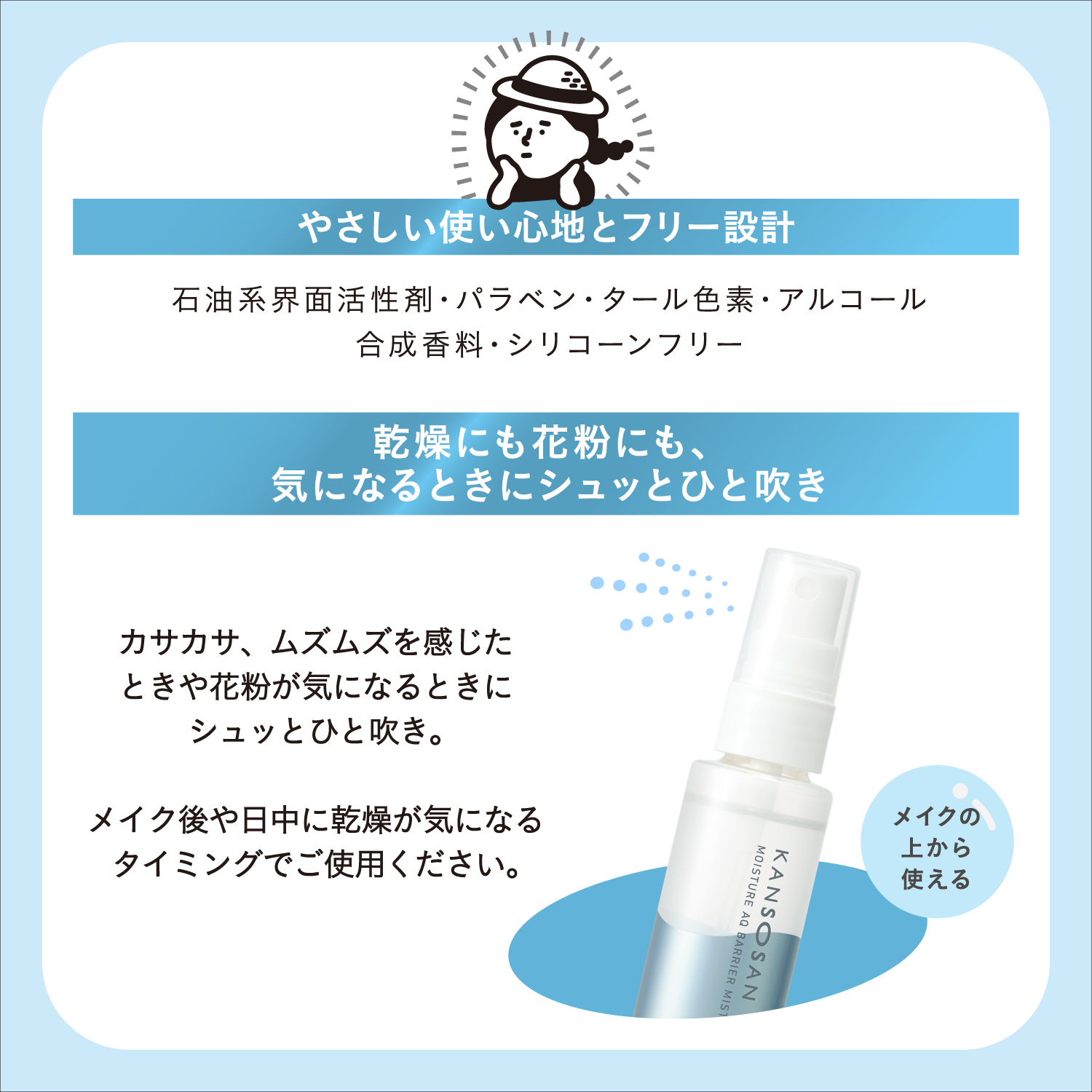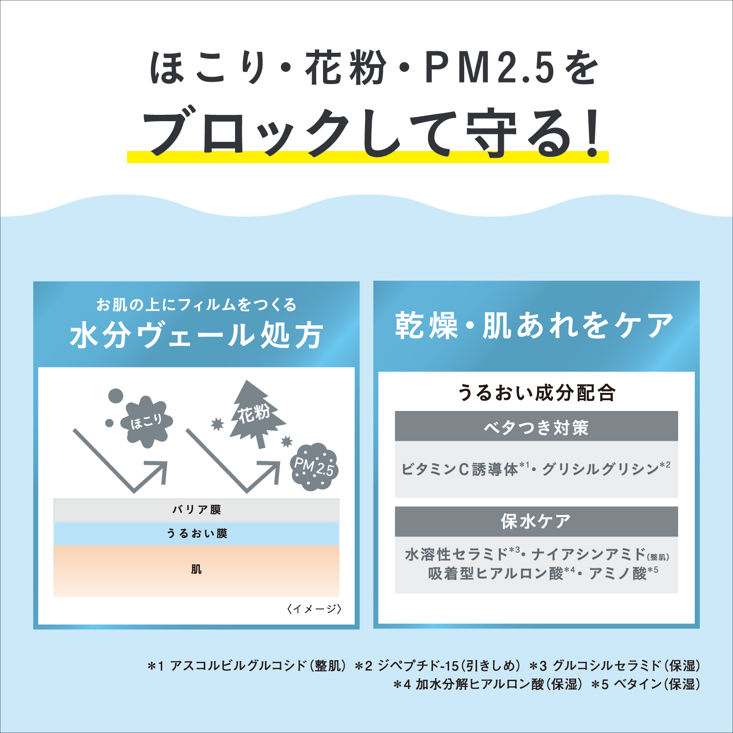 花粉・ほこり・PM2.5・ブルーライトなど乾燥の原因から肌を守り1日中しっとり乾かない肌に整えます。