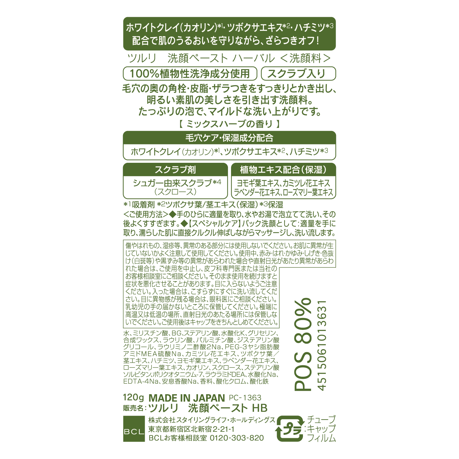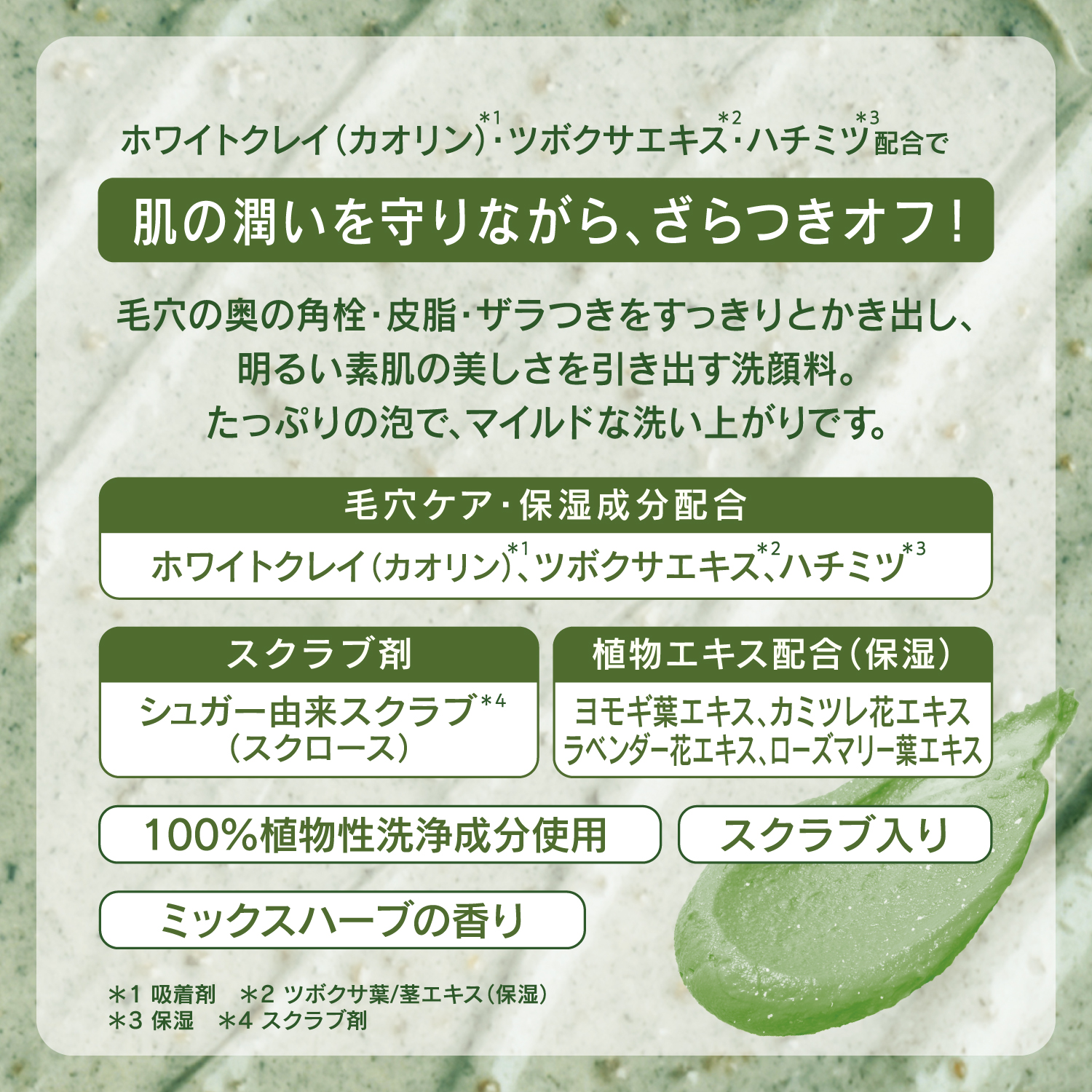 ホワイトクレイ(カオリン)*1 とスクラブで、毛穴の奥の角栓・皮脂・ザラつきをオフ。