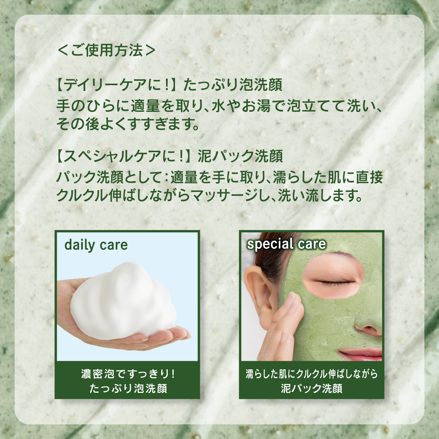 【スペシャルケア】パック洗顔として:適量を手に取り、濡らした肌に直接クルクル伸ばしながらマッサージし、洗い流します。