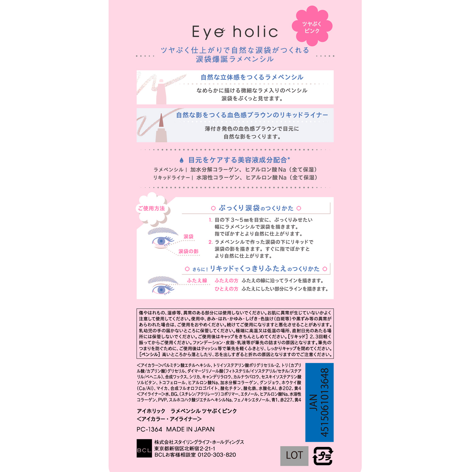 全成分 <アイカラー>パルミチン酸エチルヘキシル、トリイソステアリン酸ポリグリセリル-2、トリ(カプリル酸/カプリン酸)グリセリル、ダイマージリノール酸(フィトステリル/イソステアリル/セチル/ステアリル/ベヘニル)、合成ワックス、シリカ、キャンデリラロウ、カルナウバロウ、セスキイソステアリン酸ソルビタン、トコフェロール、ヒアルロン酸Na、加水分解コラーゲン、グンジョウ、ホウケイ酸(Ca/Al)、マイカ、合成フルオロフロゴパイト、酸化チタン、酸化鉄、水酸化Al、赤202、黄4 <アイライナー>水、BG、(スチレン/アクリレーツ)コポリマー、エタノール、ヒアルロン酸Na、水溶性コラーゲン、PVP、スルホコハク酸ジエチルヘキシルNa、フェノキシエタノール、青1、赤227、黄4