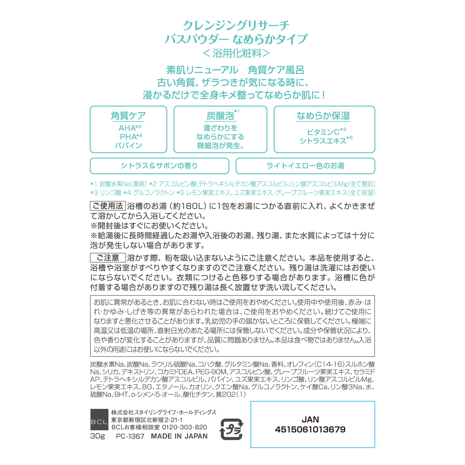 *1 リンゴ酸 *2 グルコノラクトン *3 炭酸水素Na(基剤) *4 アスコルビン酸、テトラヘキシルデカン酸アスコルビル、リン酸アスコルビルMg(全て整肌) *5 レモン果実エキス、ユズ果実エキス、グレープフルーツ果実エキス(全て保湿)