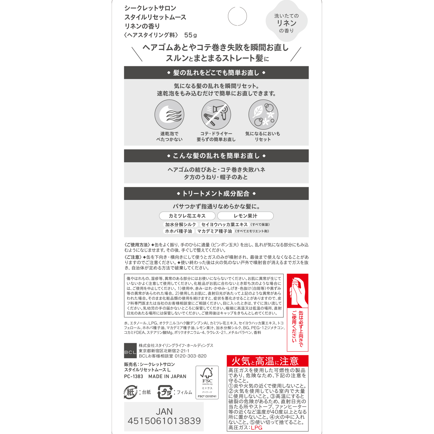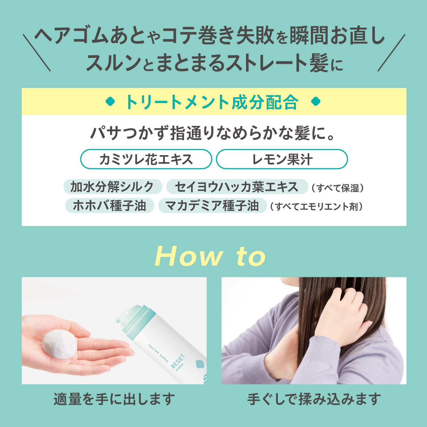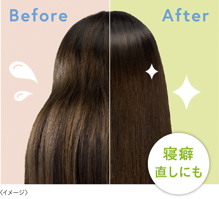 髪の美容液を泡にした速乾ムースが乱れを直しながら、うるおいを与えてスルンとまとまる髪に整えます。