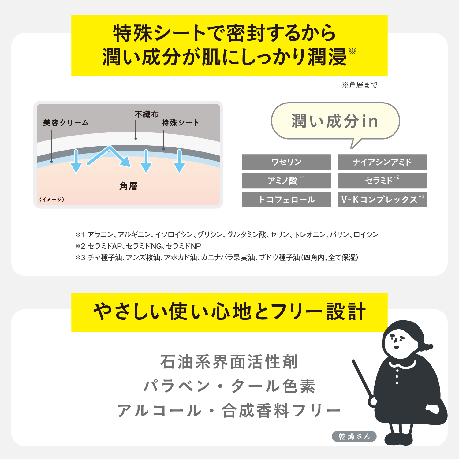 特殊な2層シートで乾燥部分をしっかりラッピングしながら保湿するので、