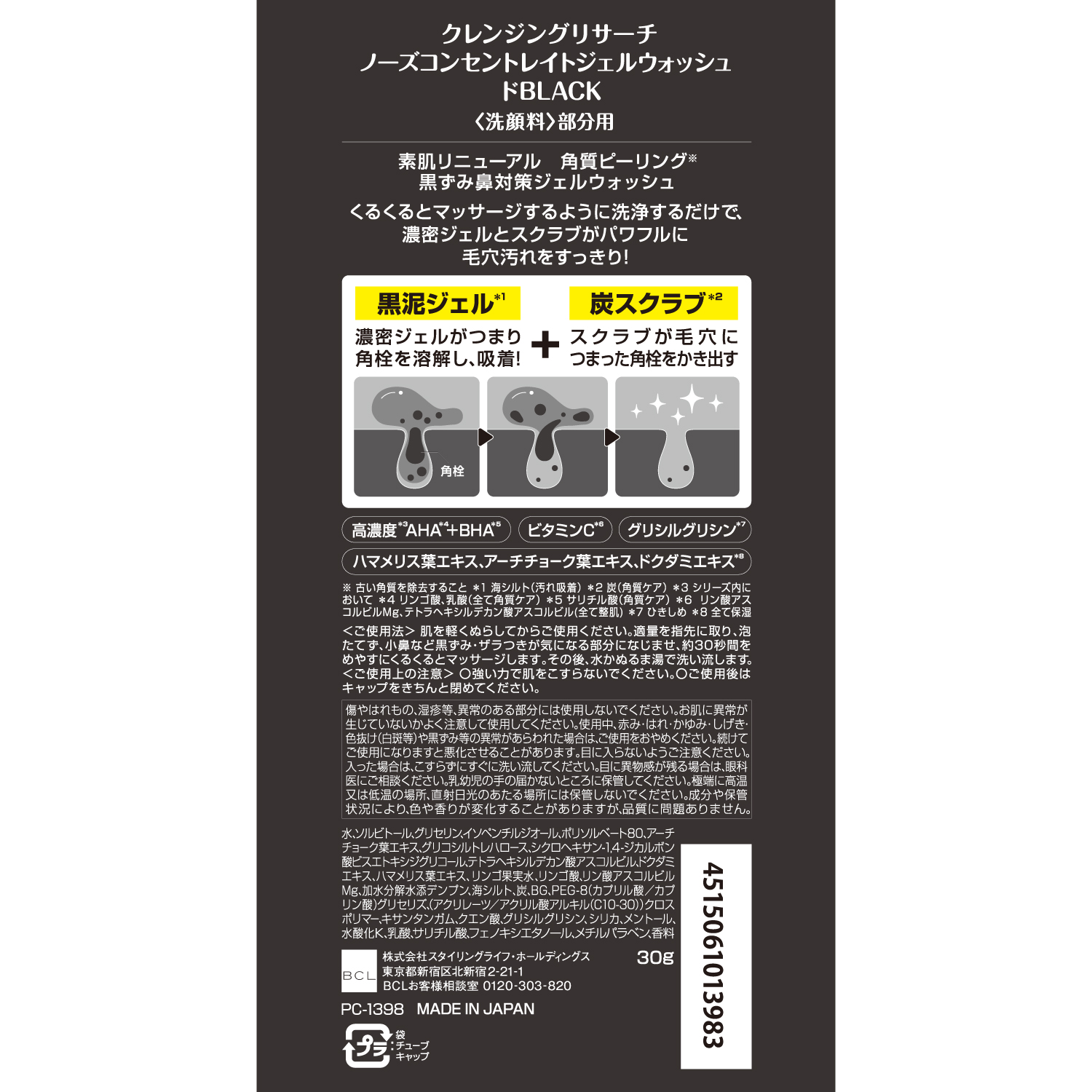 *1 海シルト(汚れ吸着)*2 炭(角質ケア)*3 古い角質を除去すること *4 シリーズ内において *5 リンゴ酸、乳酸(全て角質ケア) *6 サリチル酸(角質ケア) *7 リン酸アスコルビルMg、テトラヘキシルデカン酸アスコルビル(全て整肌) *8 ひきしめ *9 全て保湿