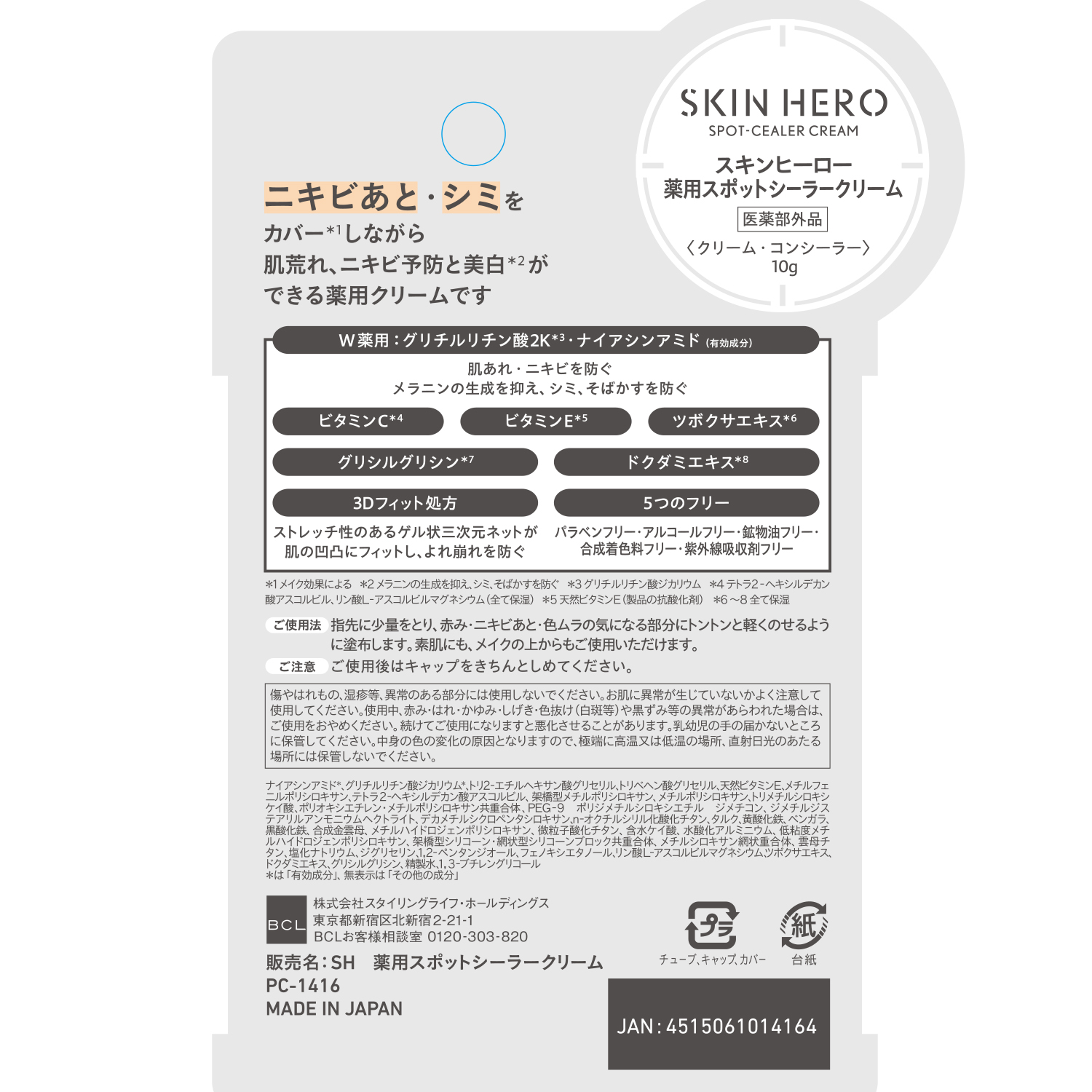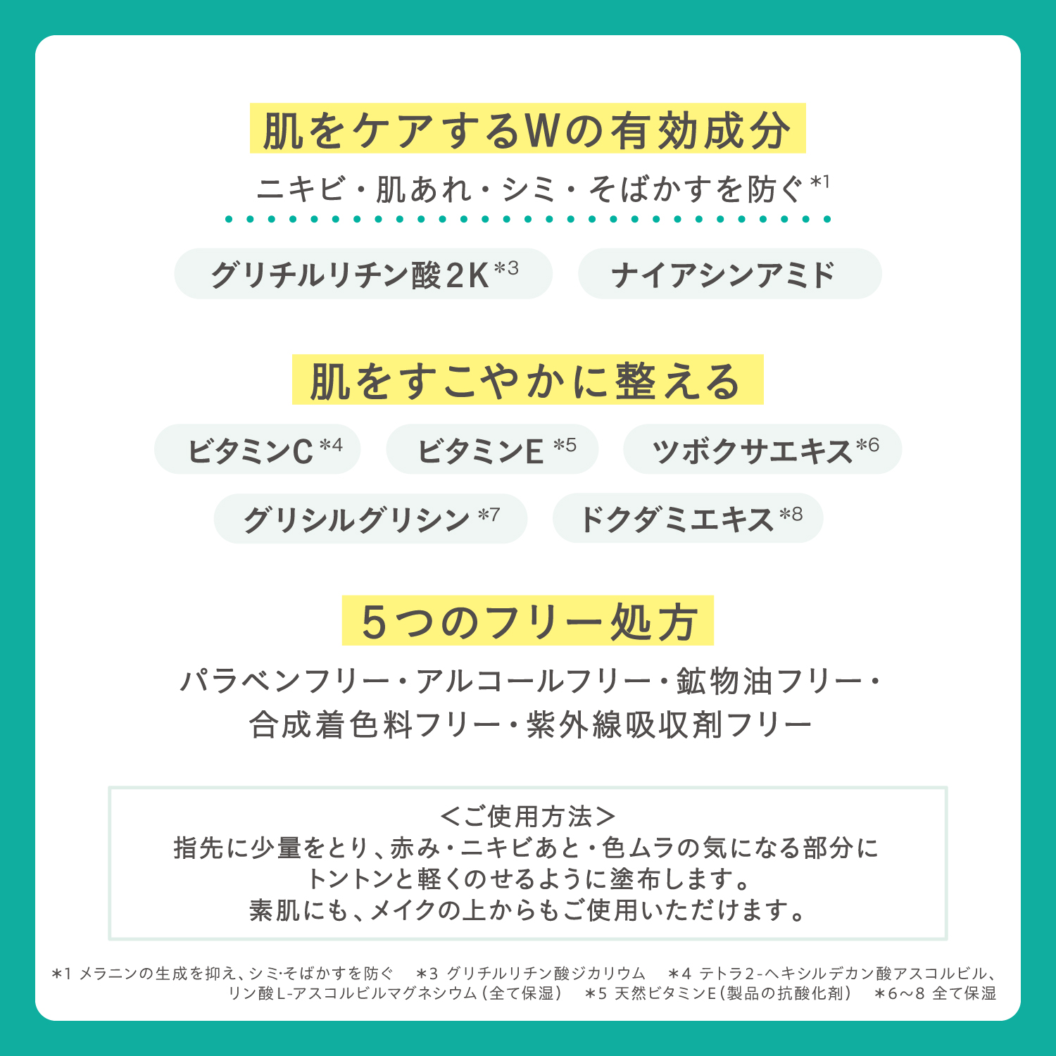 *1 塗り伸ばす時間のめやす *2 メイク効果による *3 メラニンの生成を抑え、シミ、そばかすを防ぐ *4 グリチルリチン酸ジカリウム *5 テトラ2-ヘキシルデカン酸アスコルビル、リン酸L-アスコルビルマグネシウム(全て保湿) *6 天然ビタミンE(製品の抗酸化剤) *7~9 全て保湿 *10 雲母チタン(着色剤)、メチルポリシロキサン(ベース成分)