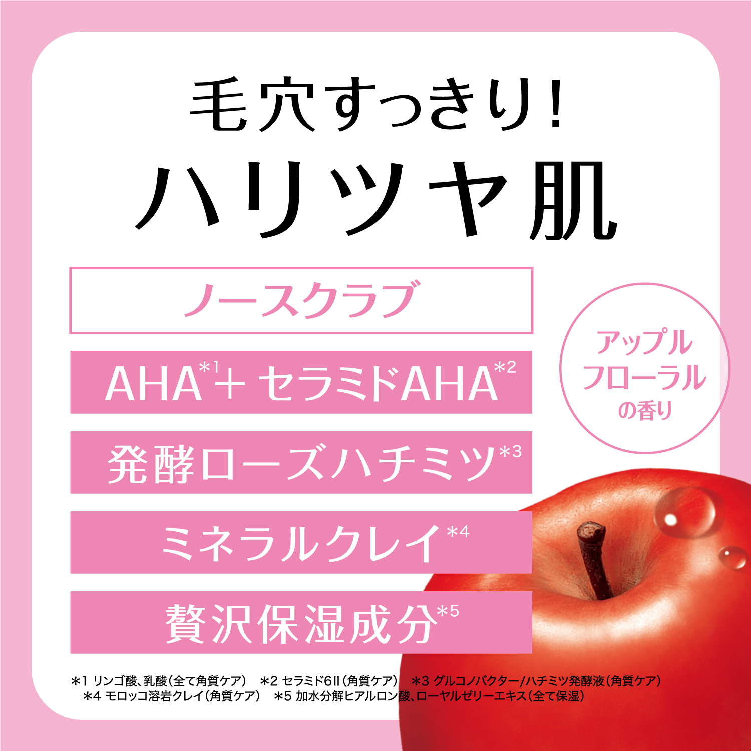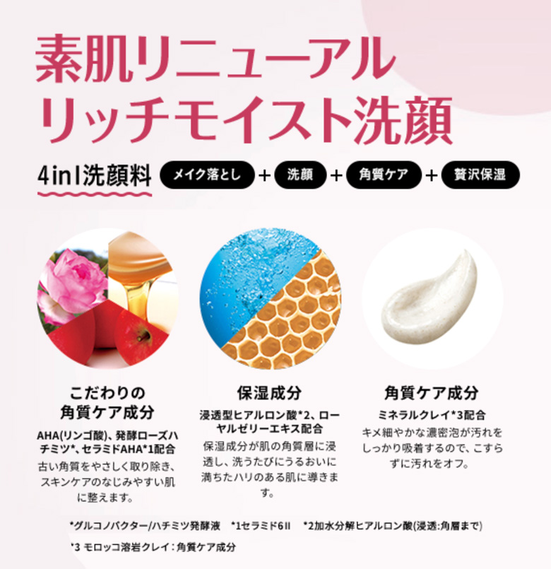 シリーズ共通のAHA(リンゴ酸)に加え、発酵ローズはちみつ*2とセラミドAHA*3、ミネラルクレイ(モロッコ溶岩クレイ)配合。