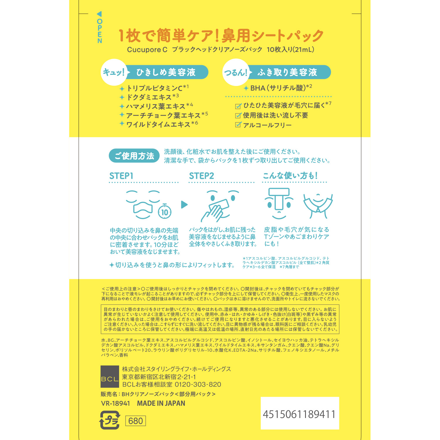 洗顔後、化粧水でお肌を整えた後にご使用ください。 清潔な手で、袋からパックを1枚ずつ取り出してご使用ください。 ※切り込みを使うと鼻の形によりフィットします。