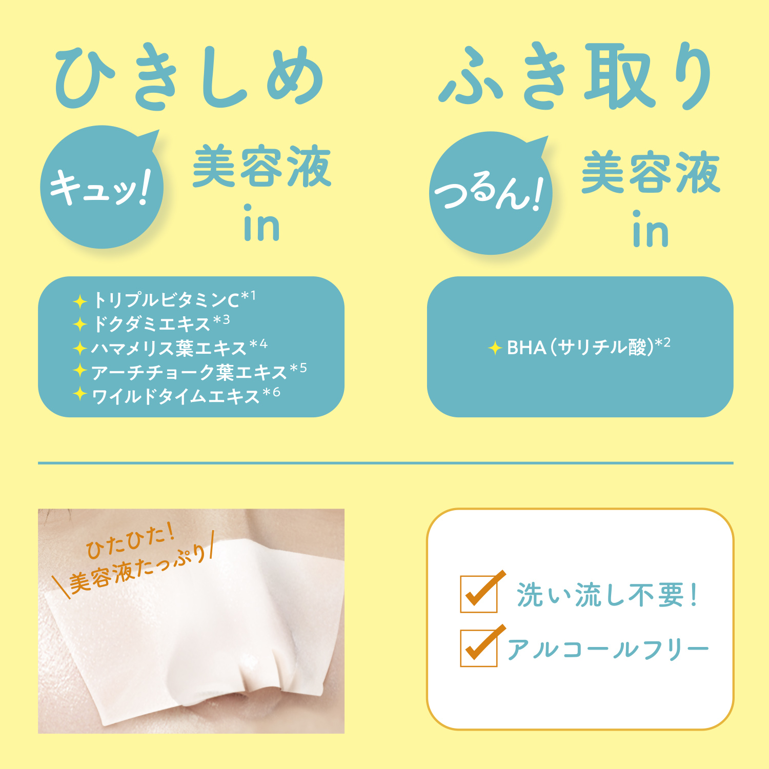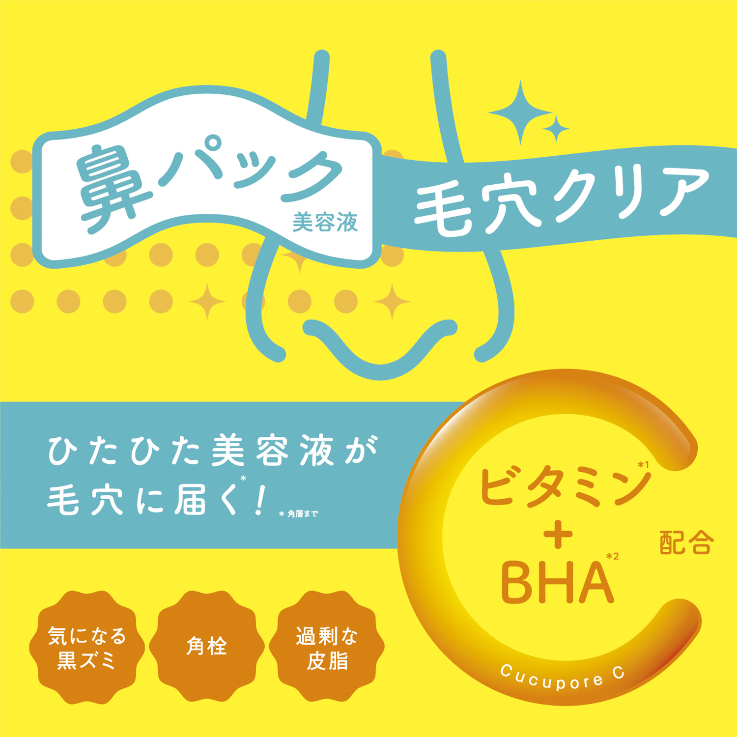 パックしてふき取るだけで、ビタミン*2+BHA*3が黒ずみ、角栓、過剰な皮脂をケアしてつるんとした肌に。