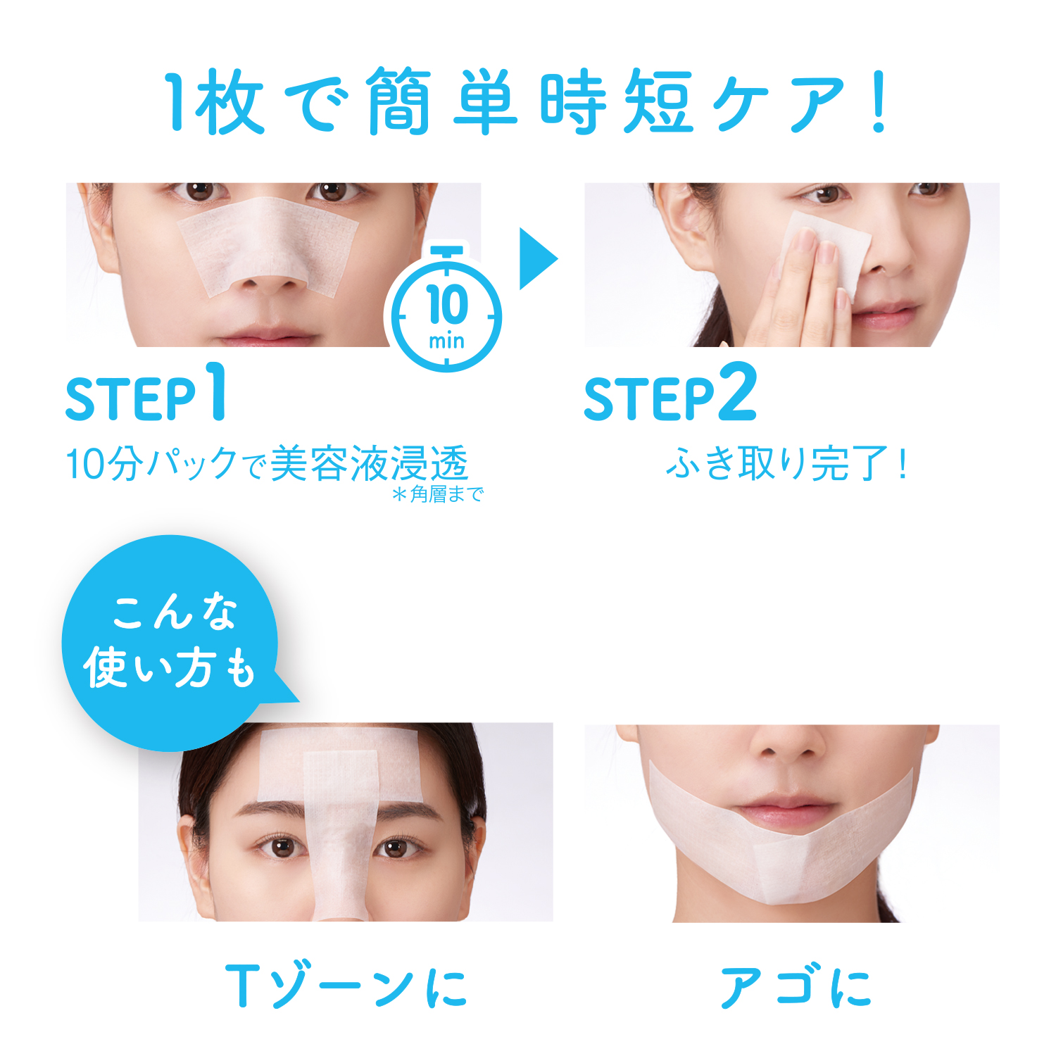 STEP1.10分パックで美容液浸透 STEP2.汚れをふき取りオフ
