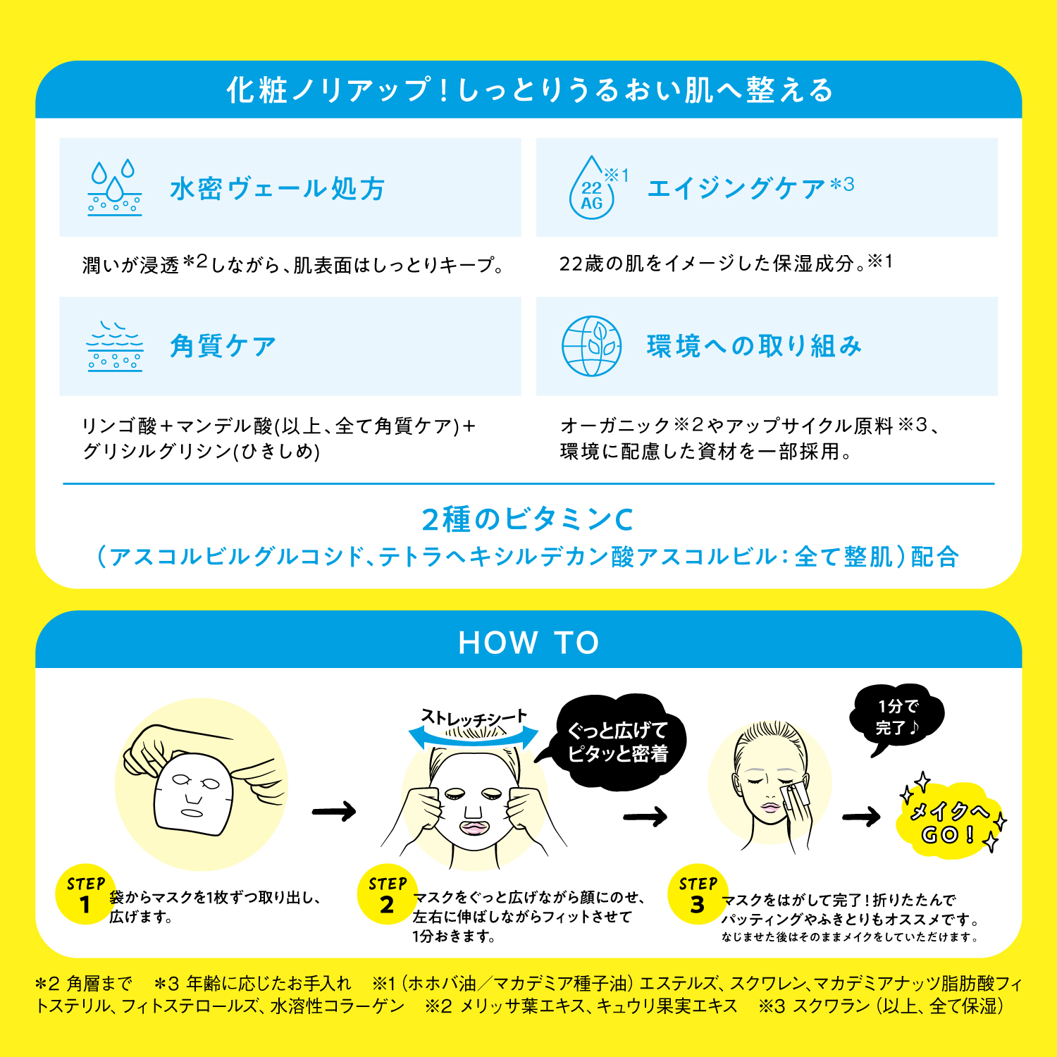 起きたての肌に寝起きの肌にそのまま貼るだけで、洗顔*2 、スキンケア、保湿下地までできる朝用のオールインワンマスクです。