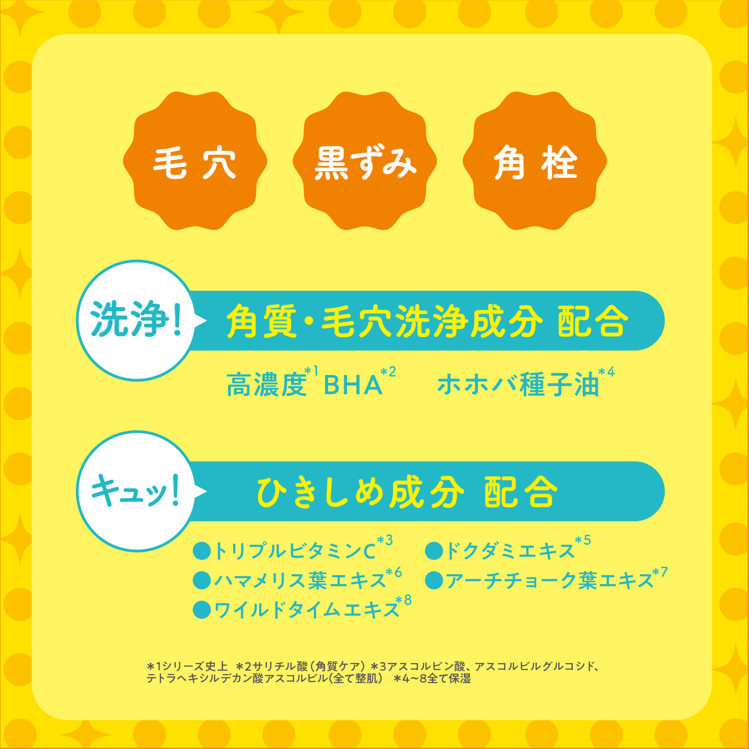 *1 シリーズ史上 *2 サリチル酸(角質ケア) *3 保湿 *4 アスコルビン酸、アスコルビルグルコシド、テトラヘキシルデカン酸アスコルビル(全て整肌) *5~8全て保湿