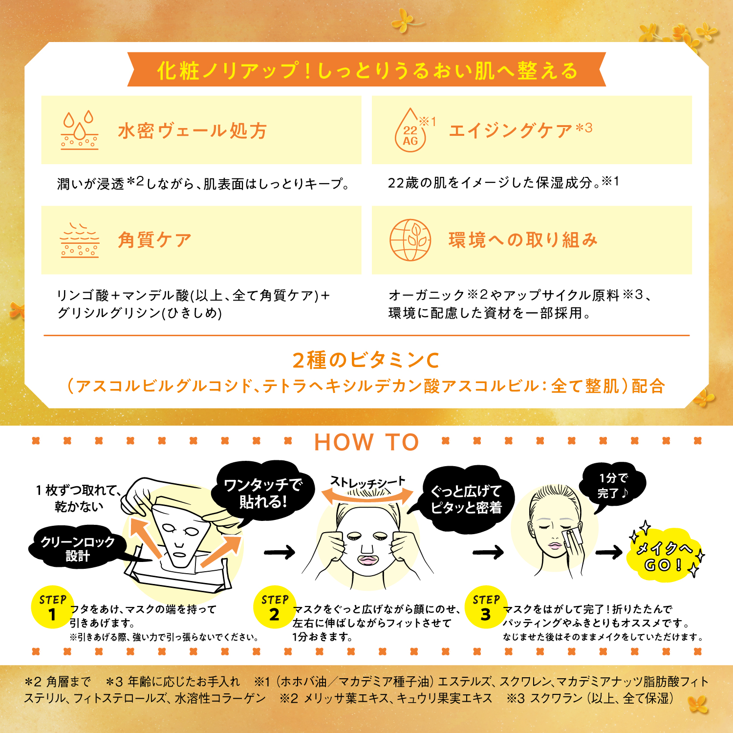 *1 使用時間目安 *2 ふきとりによる *3 角層まで *4(ホホバ油/マカデミア種子油)エステルズ、スクワレン、マカデミアナッツ脂肪酸フィトステリル、フィトステロールズ、水溶性コラーゲン(以上、全て保湿) *5 年齢に応じたお手入れ *6 アスコルビルグルコシド、テトラヘキシルデカン酸アスコルビル(全て整肌)