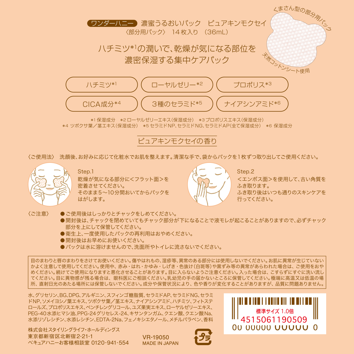 【保湿成分】・ハチミツ ・ローヤルゼリーエキス ・プロポリスエキス・ツボクサ葉/茎エキス ・3種のセラミド ・ナイアシンアミド