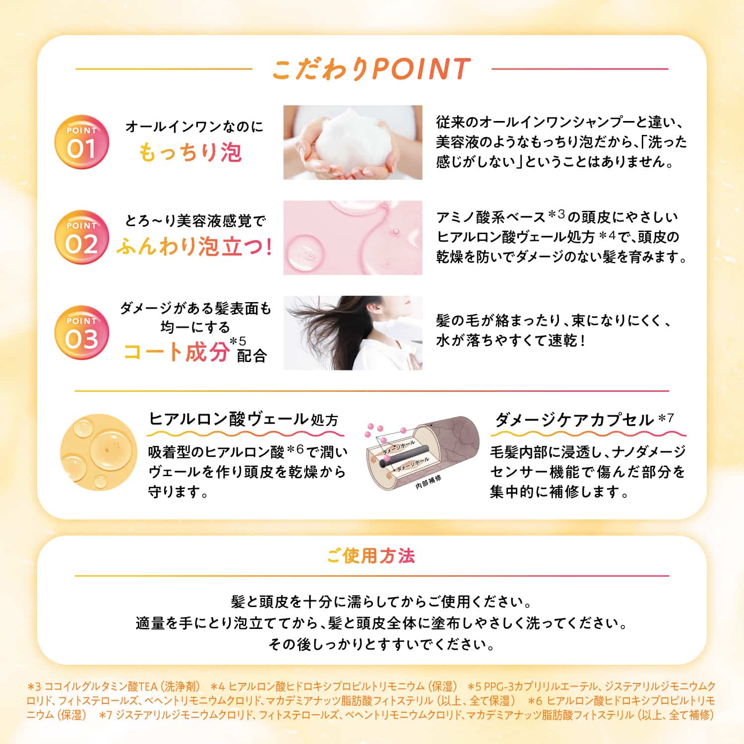 *1 ココイル加水分解コラーゲンK(保湿) *2 (加水分解シルク/ PGプロピルメチルシランジオール) クロスポリマー(保湿) *3 ヒアルロン酸ヒドロキシプロピルトリモニウム(保湿) *4 ジステアリルジモニウムクロリド、フィトステロールズ、ベヘントリモニウムクロリド、マカデミアナッツ脂肪酸フィトステリル(補修) *5 ココイルグルタミン酸TEA(洗浄剤) *6 PPG-3カプリリルエーテル、ジステアリルジモニウムクロリド、フィトステロールズ、ベヘントリモニウムクロリド、マカデミアナッツ脂肪酸フィトステリル(保湿)