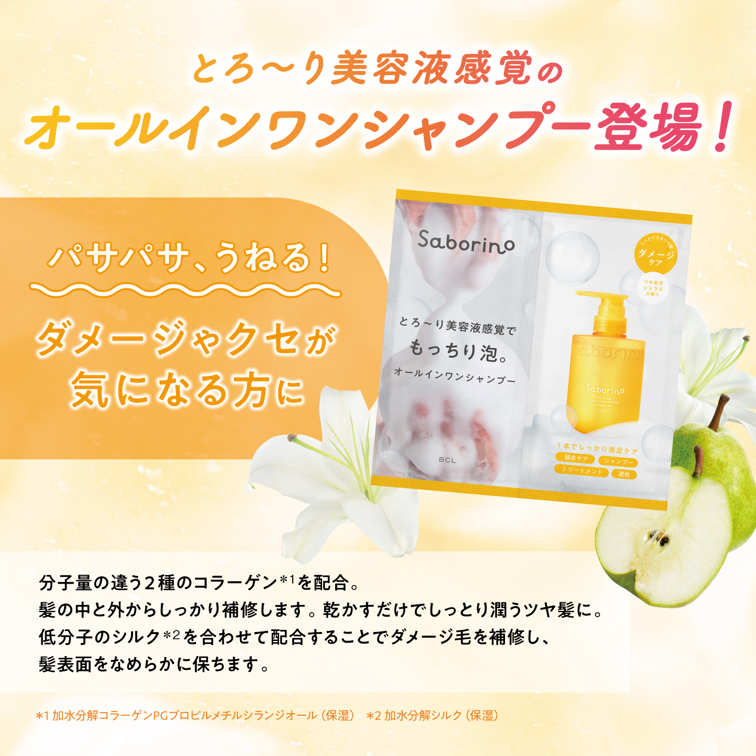 低分子のシルク*2を合わせて配合することでダメージ毛の補修と髪表面をなめらかに保ちツヤ髪に仕上がります。