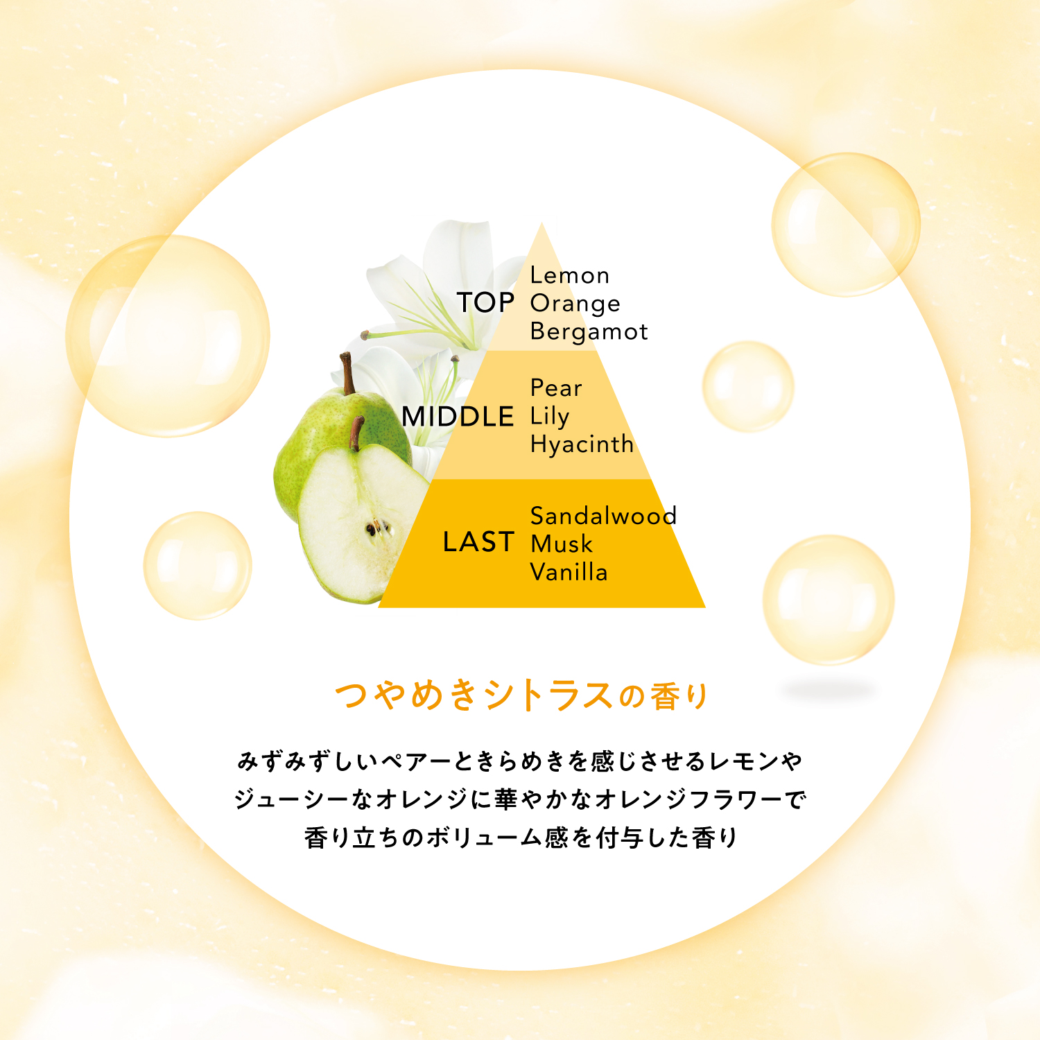 みずみずしいペアーときらめきを感じさせるレモンやジューシーなオレンジに