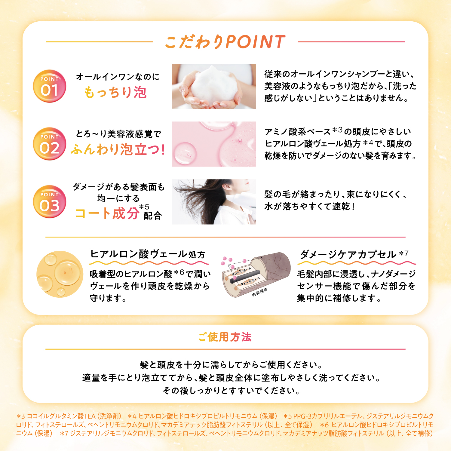 *1 ココイル加水分解コラーゲンK(保湿) *2 (加水分解シルク/ PGプロピルメチルシランジオール) クロスポリマー(保湿) *3 ヒアルロン酸ヒドロキシプロピルトリモニウム(保湿) *4 ジステアリルジモニウムクロリド、フィトステロールズ、ベヘントリモニウムクロリド、マカデミアナッツ脂肪酸フィトステリル(補修) *5 ココイルグルタミン酸TEA(洗浄剤) *6 PPG-3カプリリルエーテル、ジステアリルジモニウムクロリド、フィトステロールズ、ベヘントリモニウムクロリド、マカデミアナッツ脂肪酸フィトステリル(保湿)