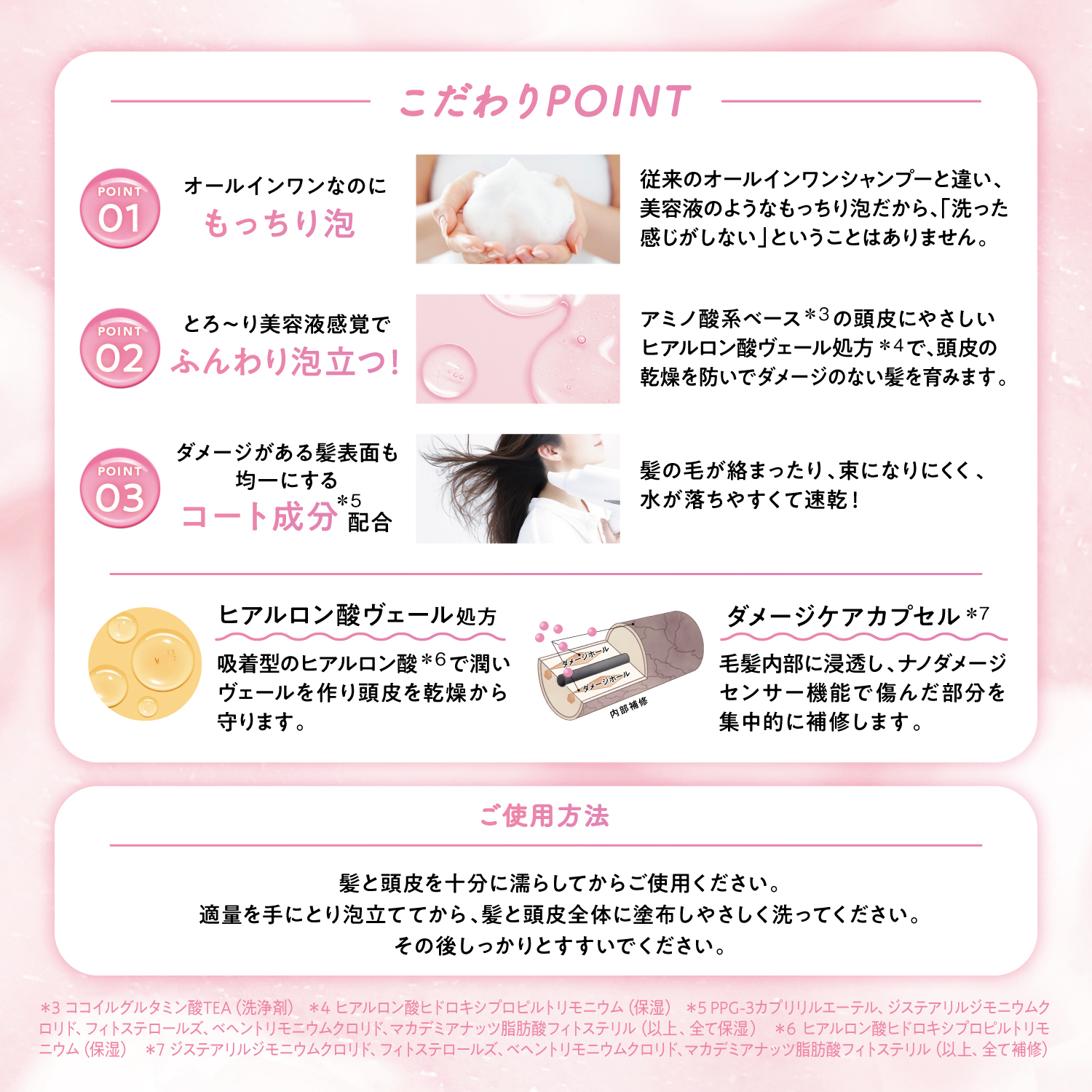 *1 加水分解コラーゲンPGプロピルメチルシランジオール(保湿) *2 加水分解シルク(保湿) *3 ヒアルロン酸ヒドロキシプロピルトリモニウム(保湿) *4 ジステアリルジモニウムクロリド、フィトステロールズ、ベヘントリモニウムクロリド、マカデミアナッツ脂肪酸フィトステリル(以上、全て補修) *5 ココイルグルタミン酸TEA(洗浄剤) *6 PPG-3カプリリルエーテル、ジステアリルジモニウムクロリド、フィトステロールズ、ベヘントリモニウムクロリド、マカデミアナッツ脂肪酸フィトステリル(以上、全て保湿)