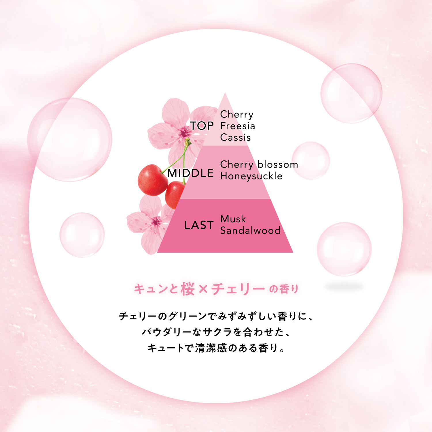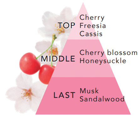 チェリーのグリーンでみずみずしい香りに、パウダリーなサクラを合わせた、キュートで清潔感のある香り。