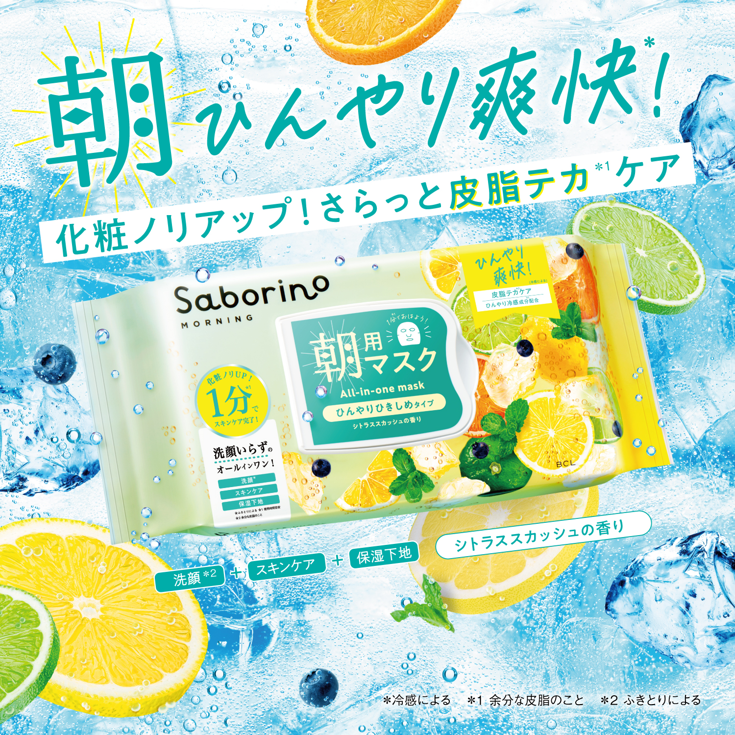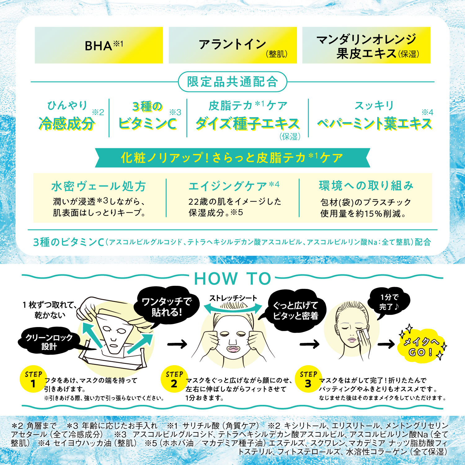 *2 冷感による *3 使用時間目安 *4 ふきとりによる *5 余分な皮脂のこと *6 サリチル酸(角質ケア) *7 アスコルビルグルコシド、テトラヘキシルデカン酸アスコルビル、アスコルビルリン酸Na(全て整肌) *8 セイヨウハッカ油(整肌) *9 角層まで *10 (ホホバ油/マカデミア種子油)エステルズ、スクワレン、 マカデミアナッツ脂肪酸フィトステリル、フィトステロールズ、水溶性コラーゲン(以上、全て保湿) *11 年齢に応じたお手入れ *12 自社調べ。25℃下において5名にて測定。冷感の感じ方には個人差があります。