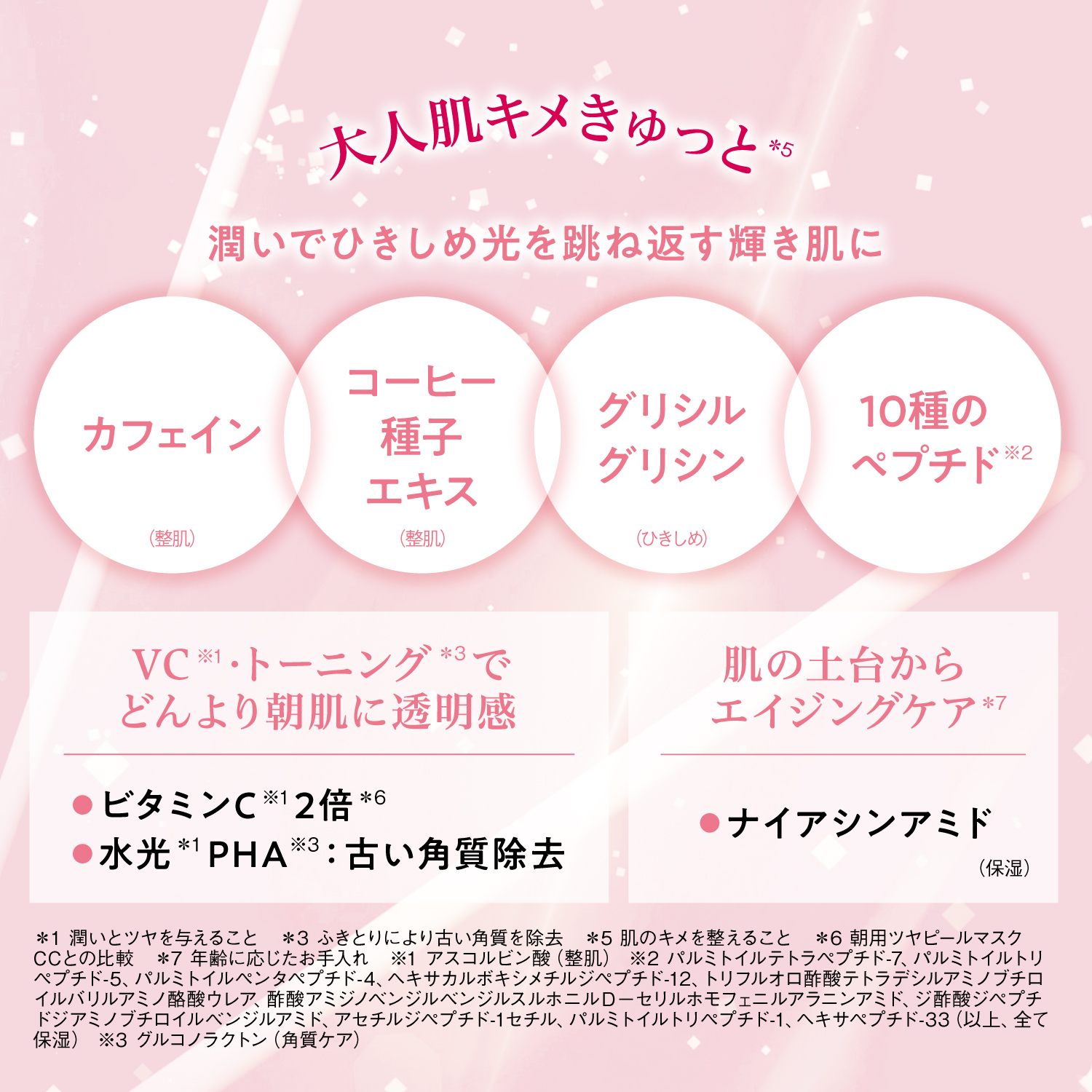 *1 使用時間目安 *2 年齢に応じたお手入れ *3 潤いとツヤを与えること *4 気持ちが上がるお手入れのこと *6 ふきとりにより古い角質を除去 *7 朝用ツヤピールマスク CCとの比較 *8 グルコノラクトン(角質ケア) *9 肌のキメを整えること *10 カニナバラ果実エキス(保湿) *11 インドナガコショウ果実エキス(保湿) *12 ふきとりによる