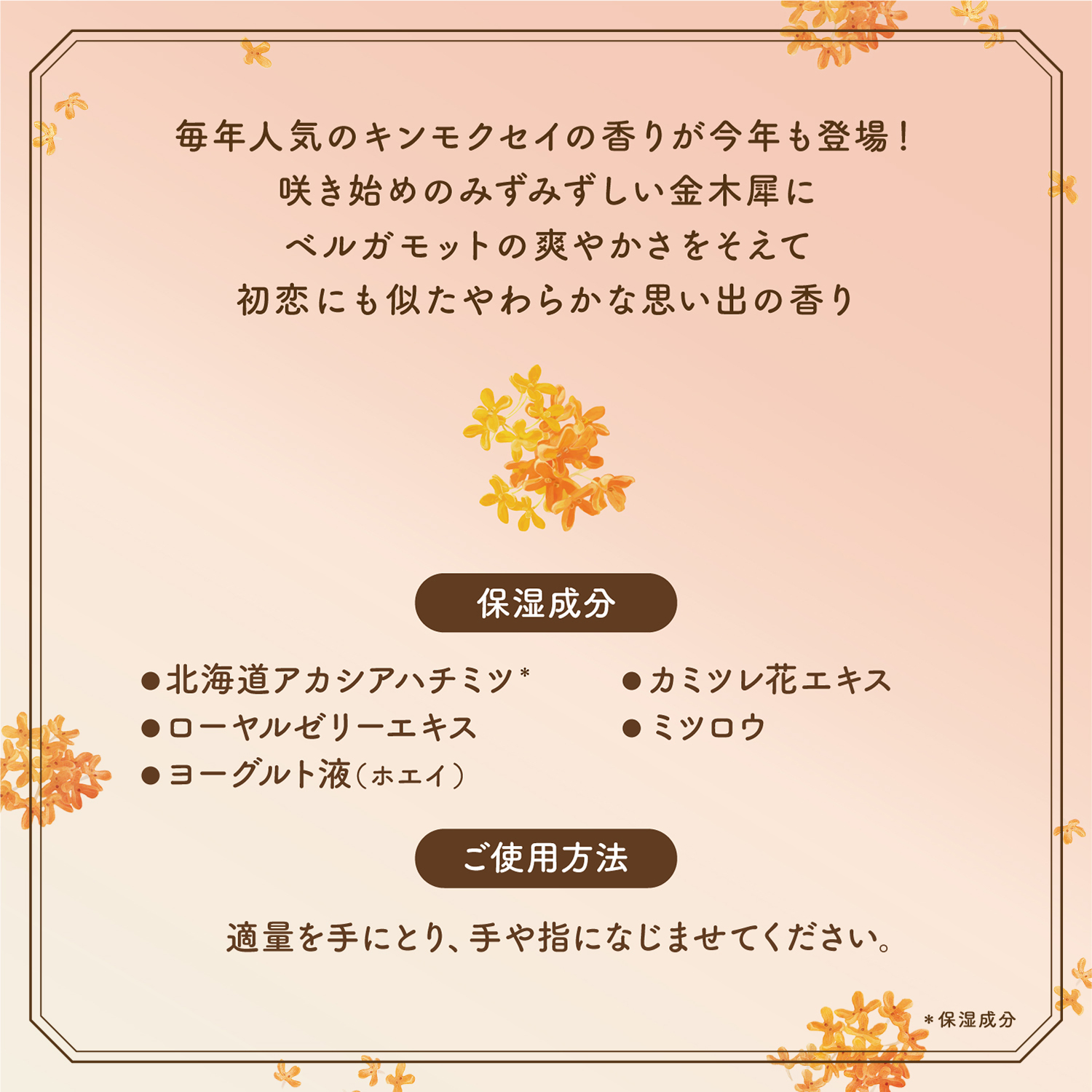 咲き始めのみずみずしい金木犀にベルガモットの爽やかさを添えて。 初恋にも似たやわらかな思い出の香り。