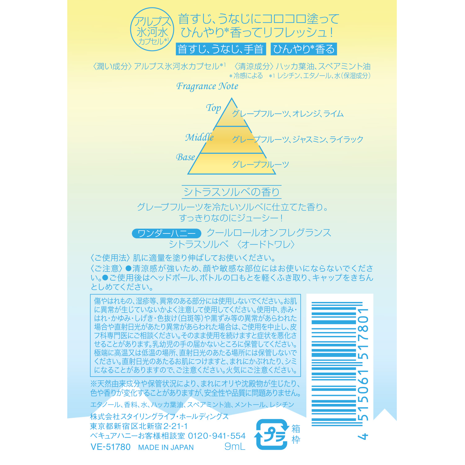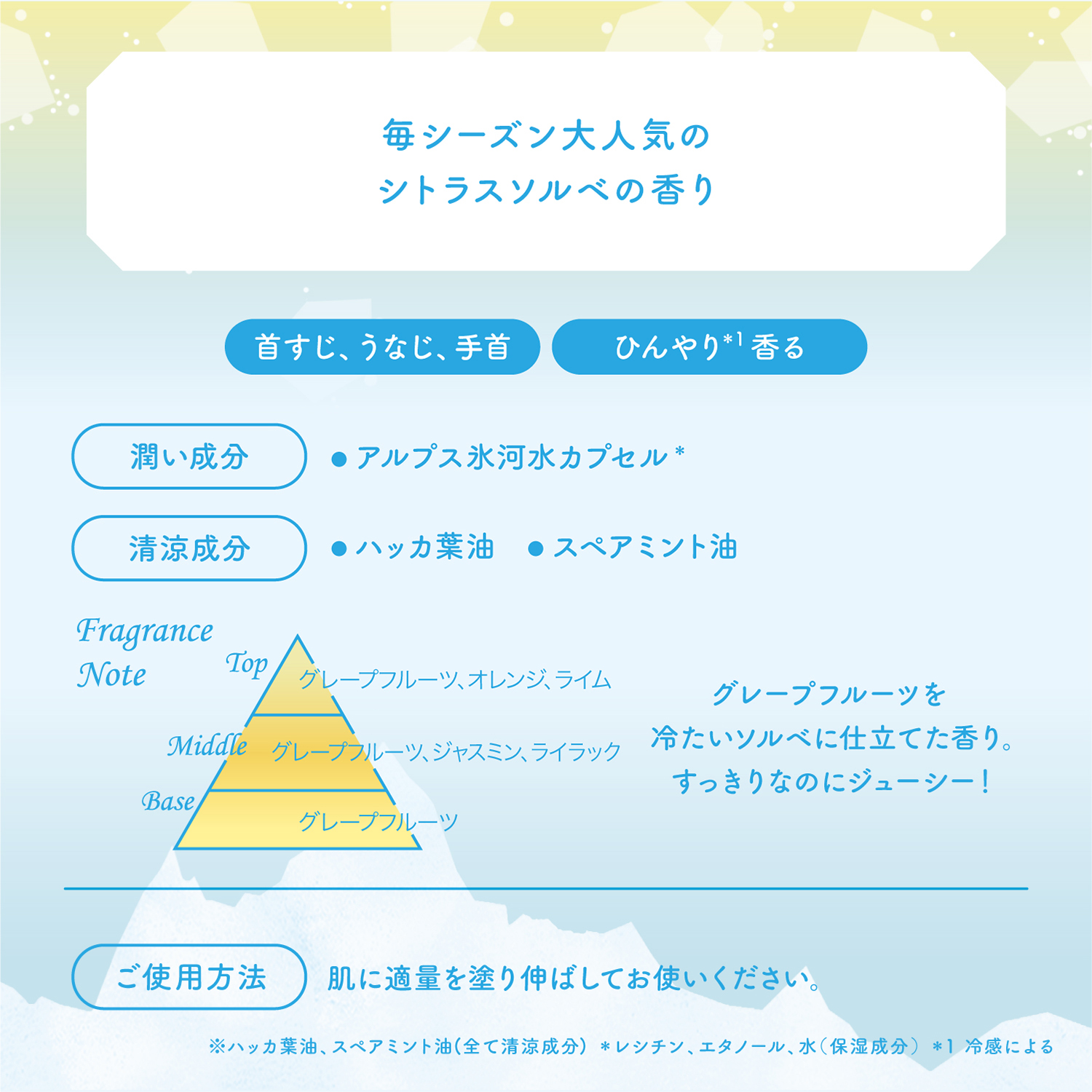 首すじ・うなじ、手首などにさっと塗れば、清涼感ある香りとともにひんやり感が広がります。