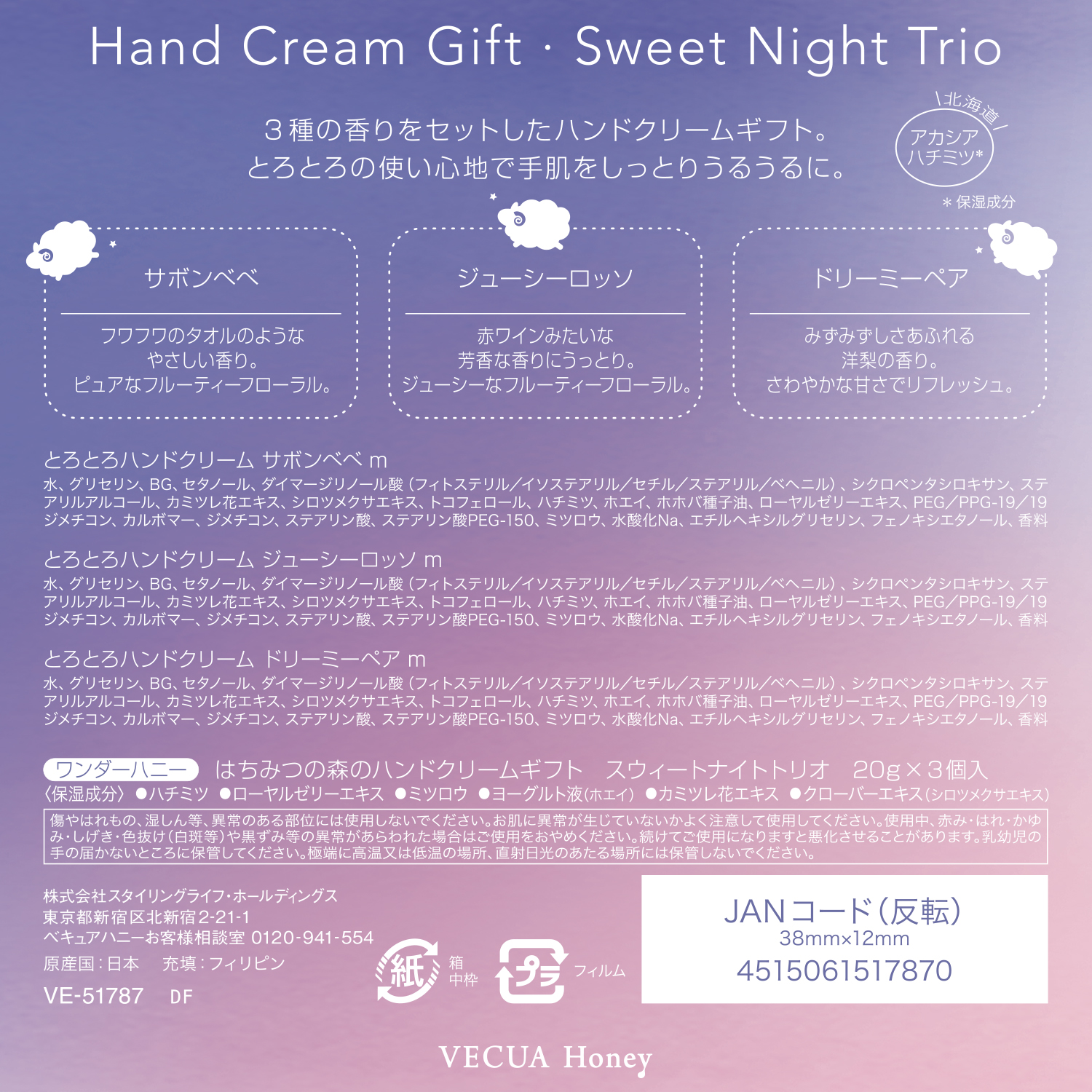 北海道アカシアハチミツ、ローヤルゼリーエキス、ミツロウ、ヨーグルト液(ホエイ)、カミツレ花エキス、クローバーエキス(シロツメクサエキス)