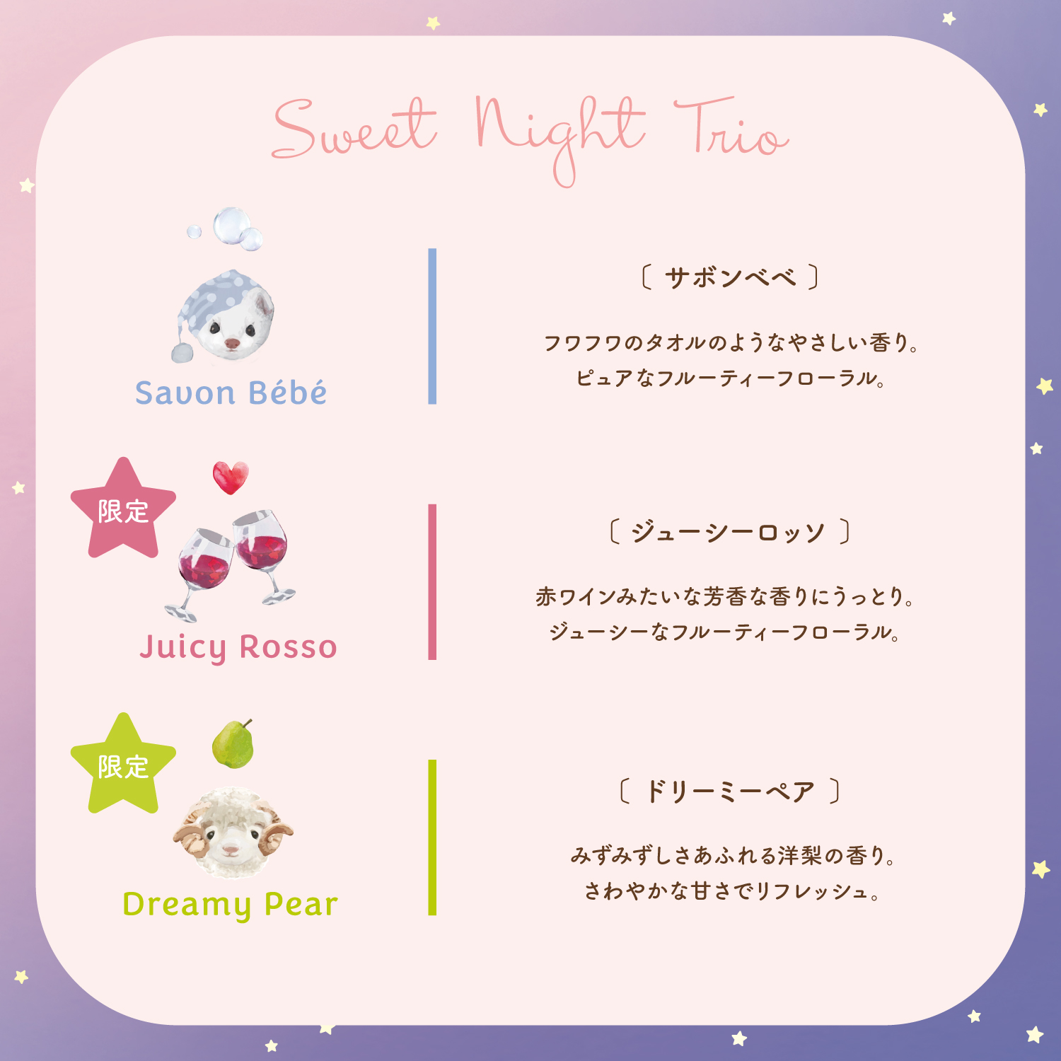 みずみずしさあふれる洋梨の香り。さわやかな甘さでリフレッシュ。