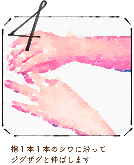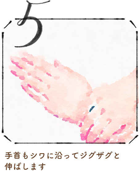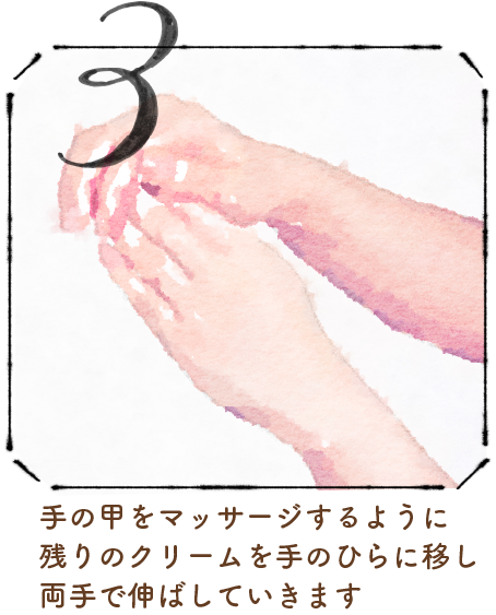 手の甲から塗って伸ばし、マッサージをしながら、指や手のひらへつけていきます。